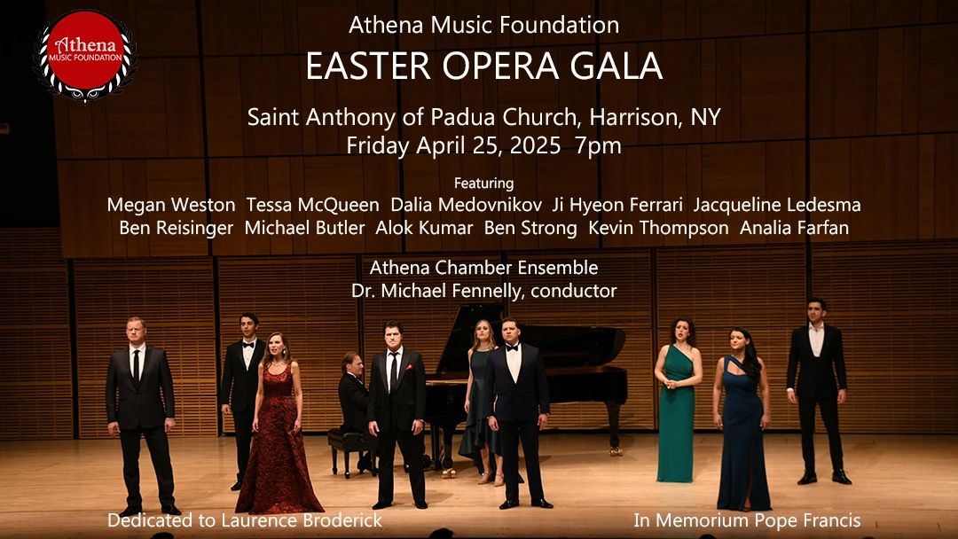 Easter Opera Gala features singers from the Metropolitan Opera and the Athena Chamber Ensemble featuring members of the New York Philharmonic. Maestro Michael Fennelly conducts this magnificent concert in memory of Pope Francis at St. Anthony of Padua in Westchester.